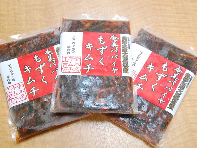 奄美大島の採れたて生もずくと新鮮な青パパイヤを使って「奄美で初めて」作られた本場韓国にもないキムチです。その日に冷凍し、